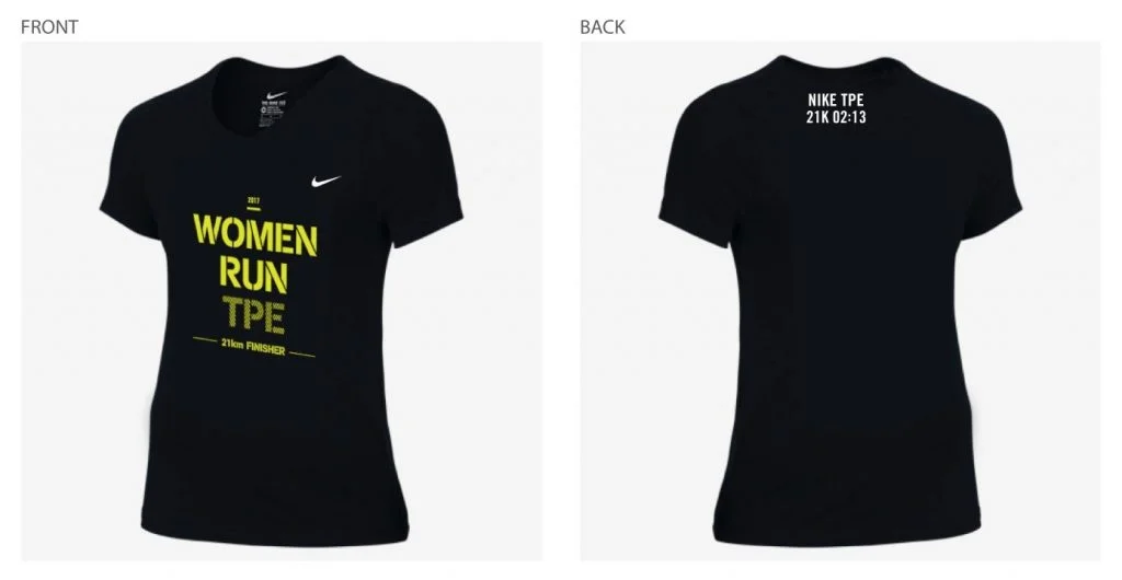 21K完賽TEE客製化服務:凡在4月23日路跑當日使用NIKE+ RUN CLUB APP,完成記錄WOMEN RUN TPE 21K賽事,即可於終點現場NIKE+服務處,享有免費在完賽TEE燙印「完賽時間」、「英文姓名」的客製化服務。