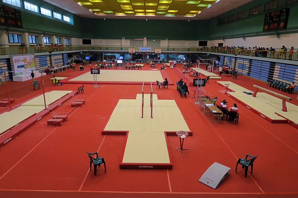 不過稍後他扶著腰,搥了一會兒說,「但像這樣弄設備一兩天下來,身體還是會痠個兩天啦。」這次彰化全國中等學校運動會,他跟其他員工和志工,一共15人,花了一天半,裝設競技體操和韻律體操器材設備,接下來很快還有五月在台北的全國大專院校運動會。