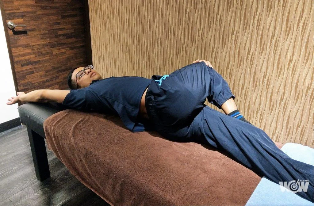 【圖說:針對田壘的背部肌肉緊繃,調理師也提供了擴胸運動,讓他能在平時也能舒緩。(圖/葉士弘攝)】