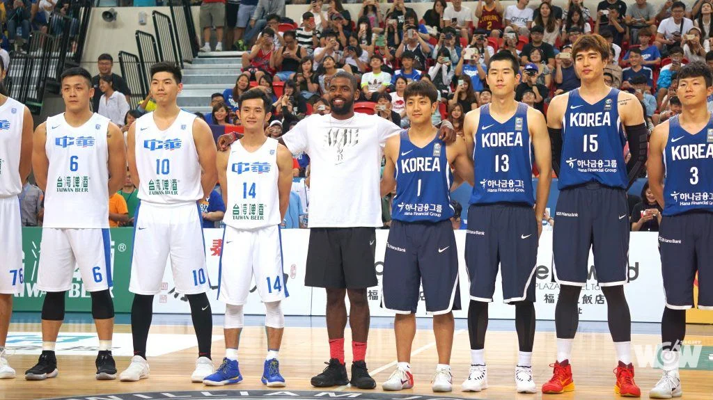 神秘嘉賓NBA球星厄文(Kyrie Irving)和中華藍、韓國的球員合影。(圖/李宇政攝)
