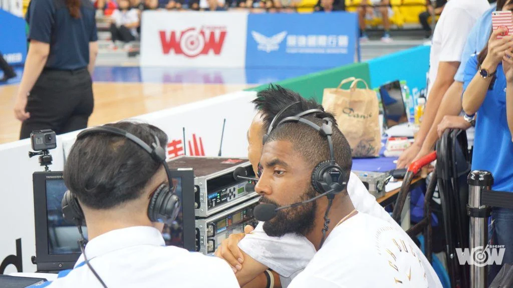 神秘嘉賓NBA球星厄文(Kyrie Irving)特地為中華藍和韓國之戰開球,還坐上緯來主播台,短暫播球賽。(圖/李宇政攝)
