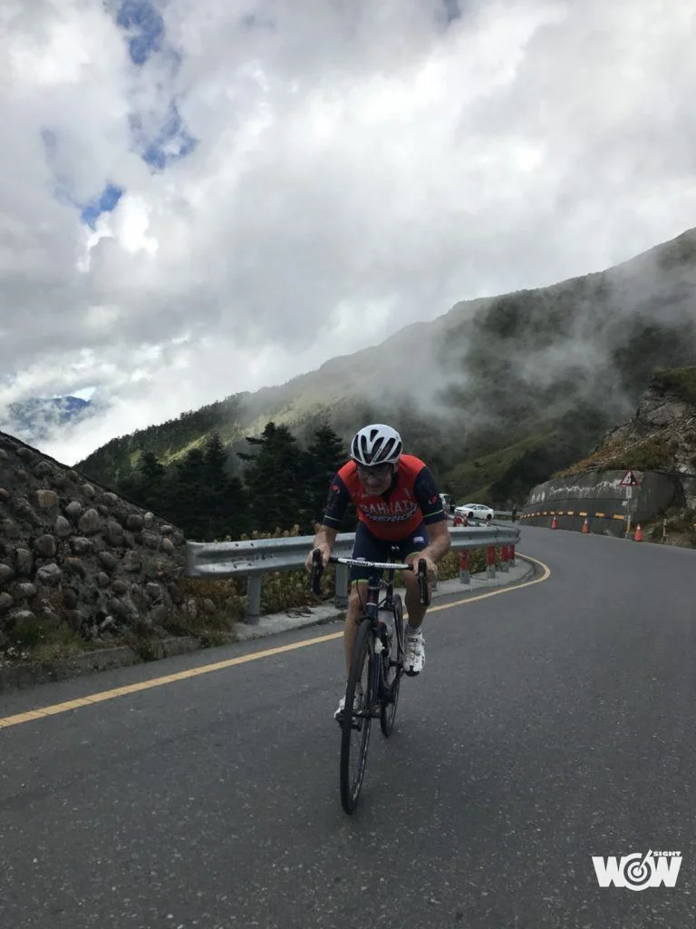 沃夫崗踩上自行車,一路從海拔0公尺的七星潭,直攻105公里遠的3275公尺武嶺,頂尖好手們走過的碧綠神木、關原、大禹嶺,以及最後10公里的「天堂路」,他都沒有錯過,沿路有人請他上車,他都堅定拒絕,即使到了最後5公里,確定無法趕在7小時關門時間前抵達終點,他依舊沒有放棄,「走也要走上去!」他最終仍靠雙腳騎進終點,完成挑戰。