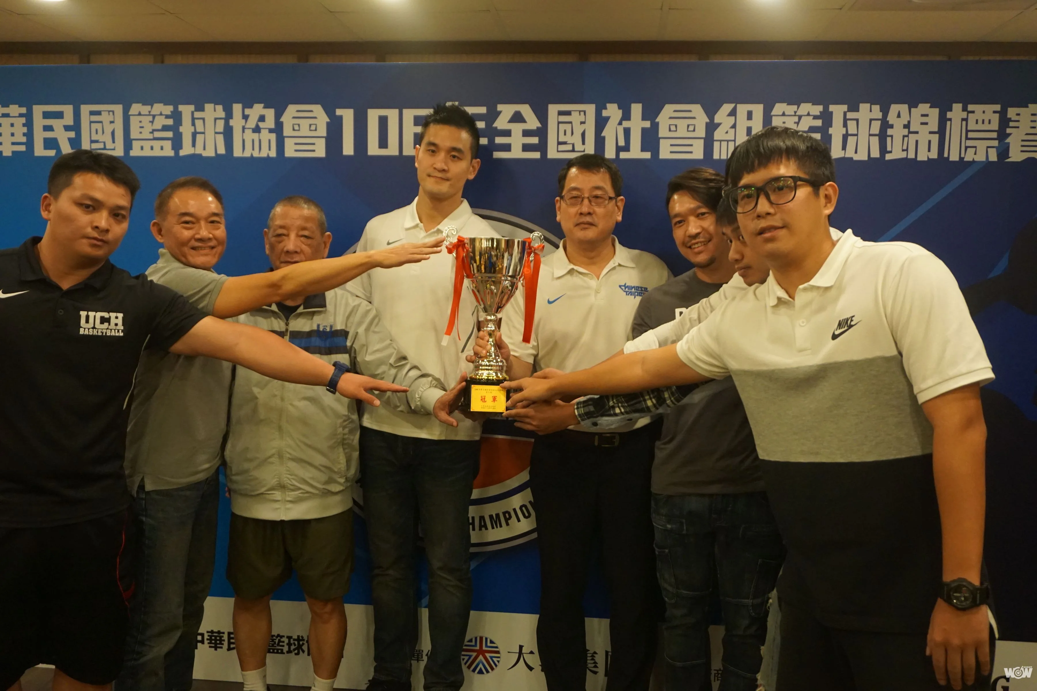 全國社會組籃球錦標賽決賽將於11月8日至12日在板橋體育館登場,男子組在冠軍盃前合影。(圖/李宇政攝)