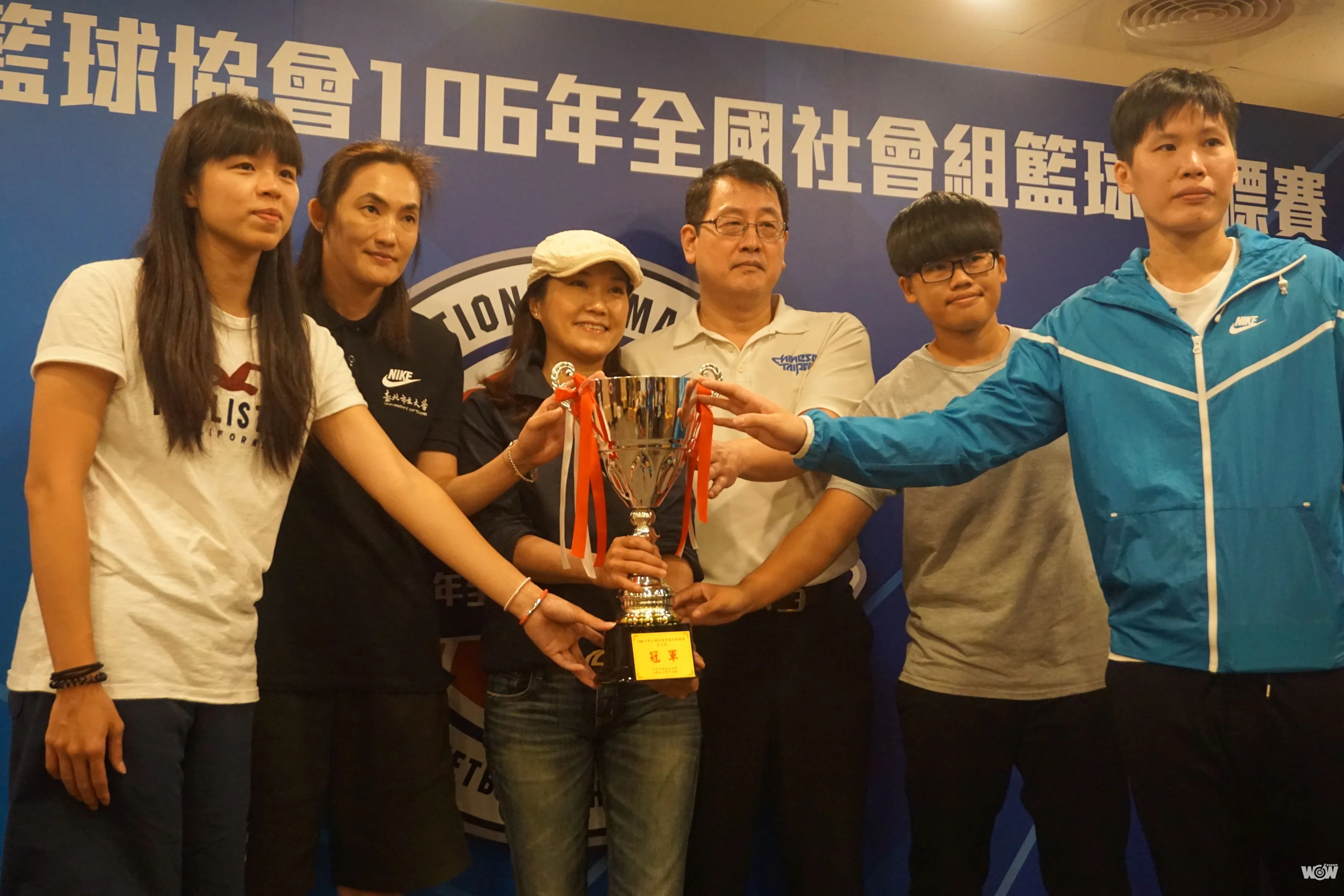 全國社會組籃球錦標賽決賽將於11月8日至12日在板橋體育館登場,女子組在冠軍盃前合影。(圖/李宇政攝)