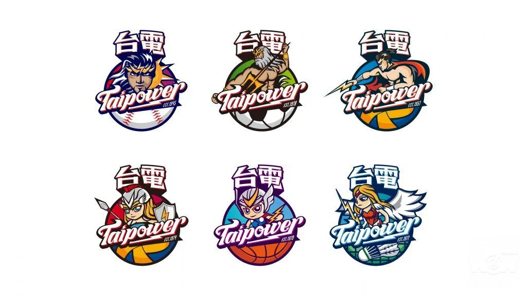 台電企業球隊新LOGO,上排左起:男子棒球、男子足球、男子排球 ;下排左起:女子排球、女子籃球、女子羽球(圖/台電提供)