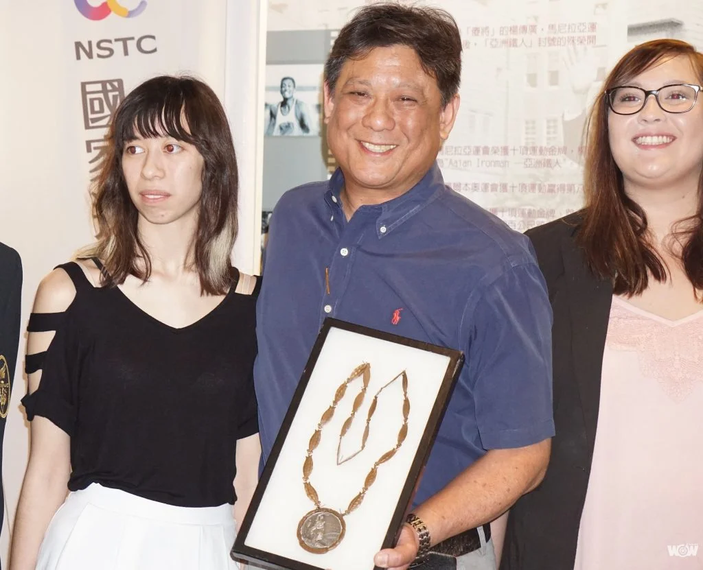 楊傳廣之子楊世運長年旅美,他今天帶著女兒把獎牌贈予國家運動訓練中心收藏,由國訓中心李文彬執行長代表接受。