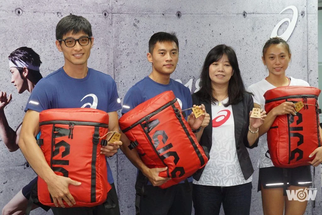 封面圖/亞瑟士總經理謝玉真(右2),致贈裝備給選手廖靜賢(右1)、廖晏均(右3)、陳莞玫(右4)。李宇政攝