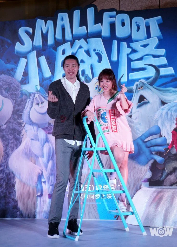 電影小腳怪明天28日要正式上映,女主角「美姬」中文配音由歌手「最強怪物新人」安那擔綱,身高152公分高,跟202公分高的中鋒曾文鼎一同出席首映會,兩人50公分差距,合影呈現最萌身高差。主辦單位特別拉張梯子,讓兩人順利同框一般高。