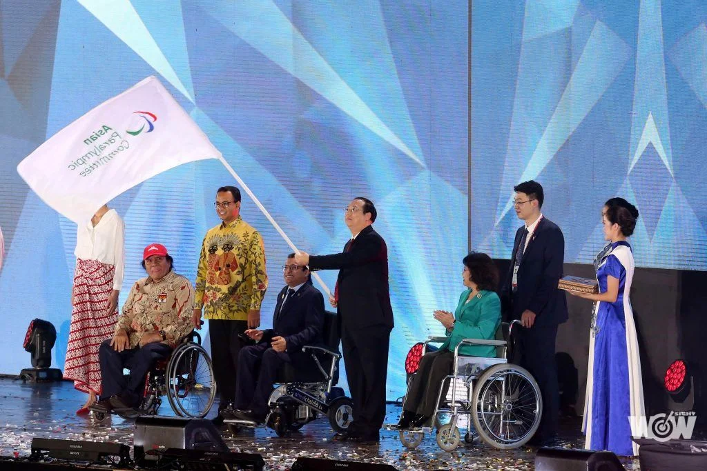 雅加達亞帕運今天落幕,杭州為下屆舉辦城市,杭州代表在閉幕儀式中接下亞洲帕拉林匹克委員會會旗。(圖/INAPGOC)