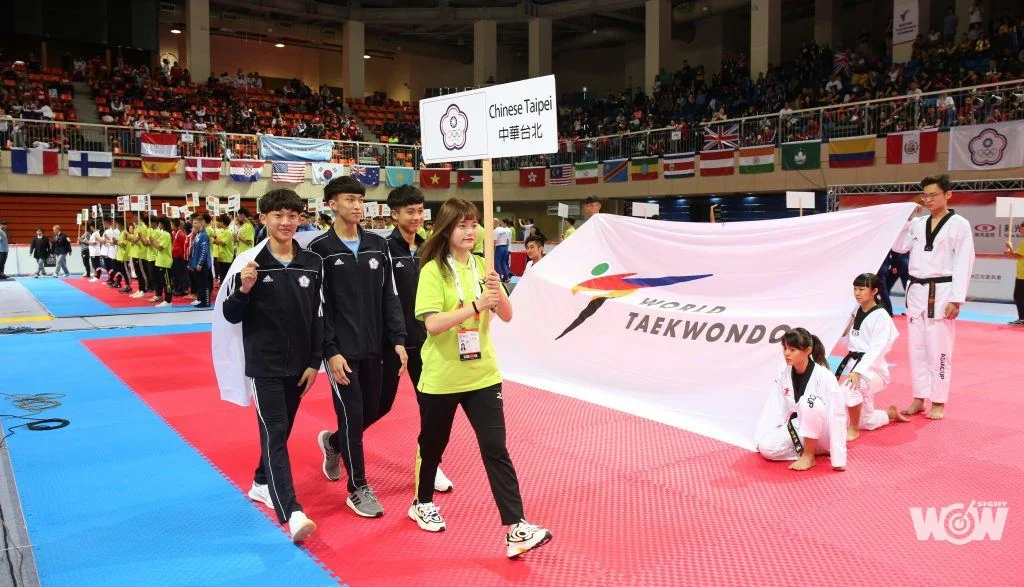 世界跆拳道品勢錦標賽今天在台北市立大學天母校區體育館開幕,中華隊進場。(圖/中華跆協提供)