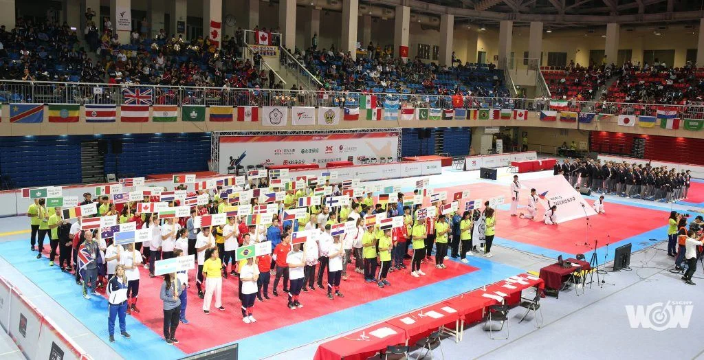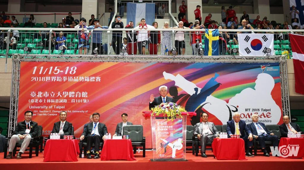 世界跆拳道品勢錦標賽今天在台北市立大學天母校區體育館開幕,動感的音樂以及熱情的加油聲,讓這項台灣首度承辦的賽會盛大展開。世界跆拳道聯盟會長趙正源在開幕典禮致詞時表示,這是歷來最大的世錦賽。