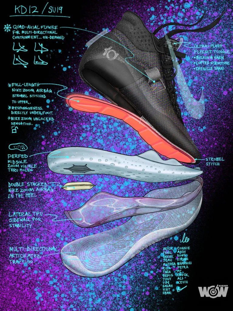 專家確定氣墊在什麼部位需要靈活性,類似於 KYRIE 5 中氣墊的凹槽紋路設計,也應用在 KD12 的Air Zoom 氣墊上,使其能夠順應穿著者的運動方向彎曲。