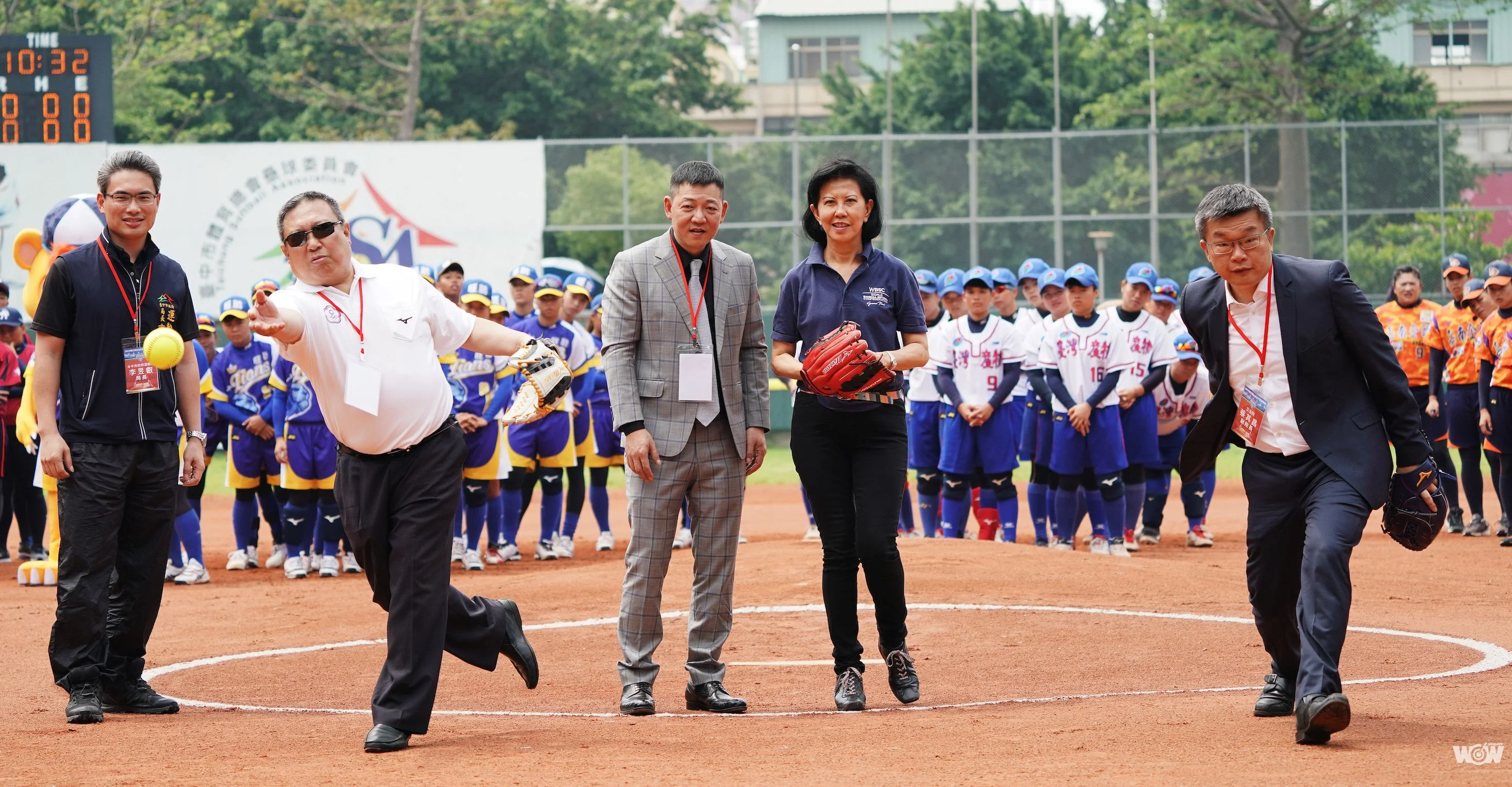 封面圖/中華奧會主席林鴻道(左2)、世界棒壘球總會秘書長劉姳助(右2)、立法院副院長蔡其昌(右1)於開幕開球。