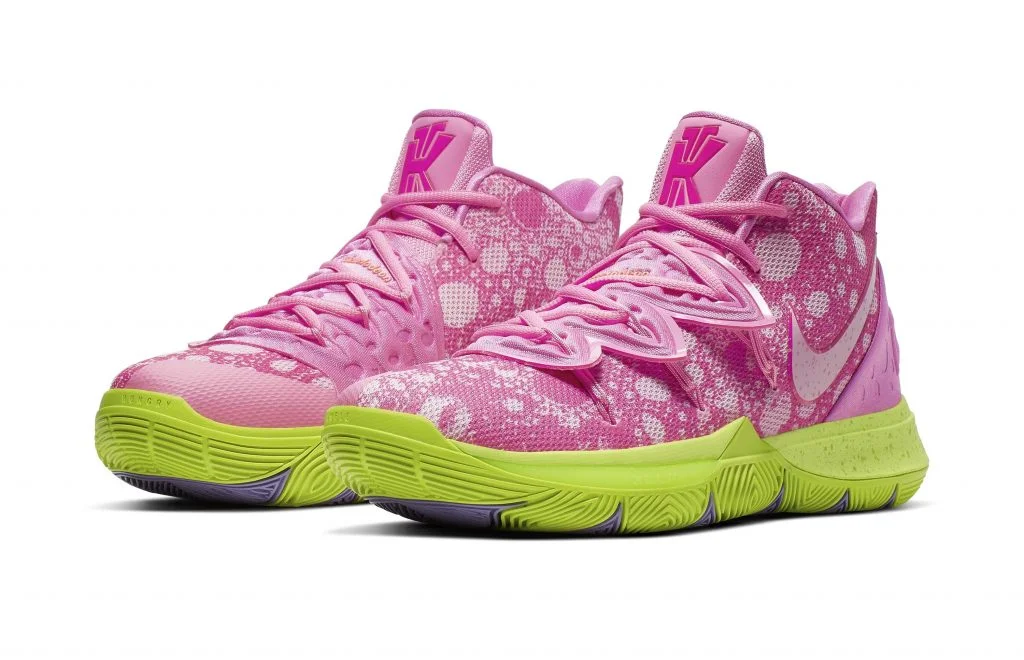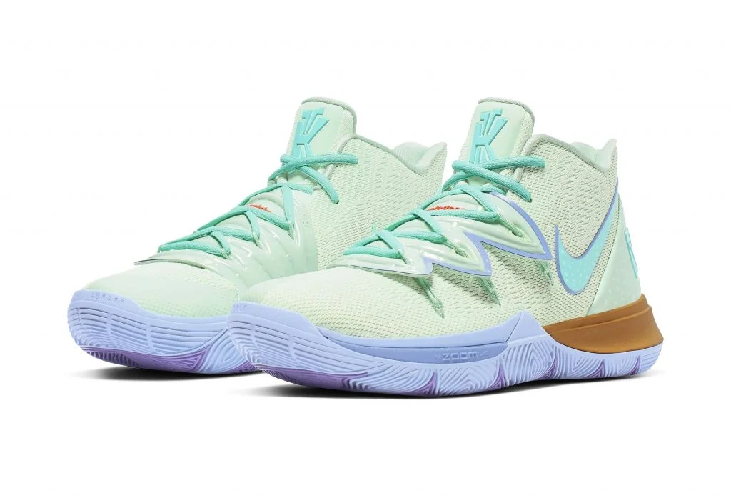 在此系列中,“海綿寶寶”、“派大星”、“章魚哥”都有根據他們獨一無二角色特徵打造的配色鞋款。KYRIE 5海綿寶寶配色有著亮黃色的鞋面,鞋底則以棕色和紅色的點綴來呼應他的日常穿著。