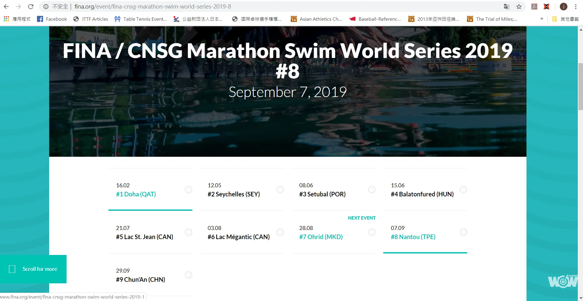 2019年國際泳總(FINA)馬拉松游泳世界巡迴賽第8站,確定將於9月7日在南投日月潭舉行,中華泳協理事長曾正宗正式對外界宣布,他強調,經過不斷努力,終於將世界最高水準的馬拉松游泳賽事帶到台灣,心情非常感動,更希望透過高等級賽事,宣揚日月潭的好山好水!