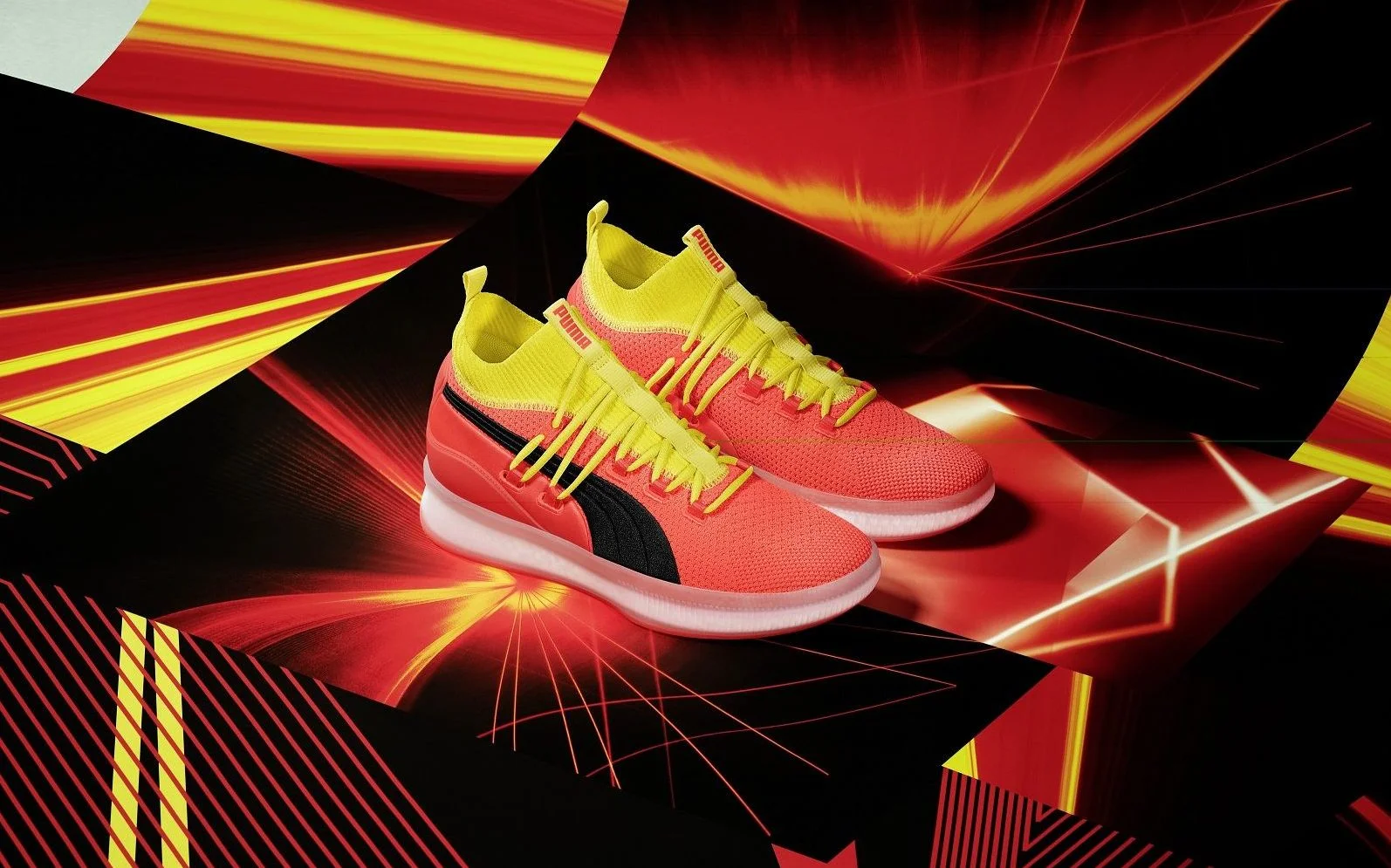以籃壇傳奇人物 Walt Clyde Frazier 為名,PUMA Clyde Court 時尚高調的鞋型輪廓搭配螢光色系亮眼配色,大膽打破傳統籃球鞋的設計框架,鞋底置入全掌式 HYBRID 創新中底科技,結合 PUMA 兩大領先科技 NRGY 避震顆粒與 IGNITE 超彈力材質,提供優異避震及能量回饋雙大機能,輔以耐磨橡膠大底包覆,增強耐久性及摩擦力,鞋面採用頂級雙層高機能針織網眼鞋面,提供透氣及包覆效果,對籃球場上的中鋒及大前鋒球員來說無疑是一大利器,輔助在籃下位移、跳躍等動作更安全舒適。