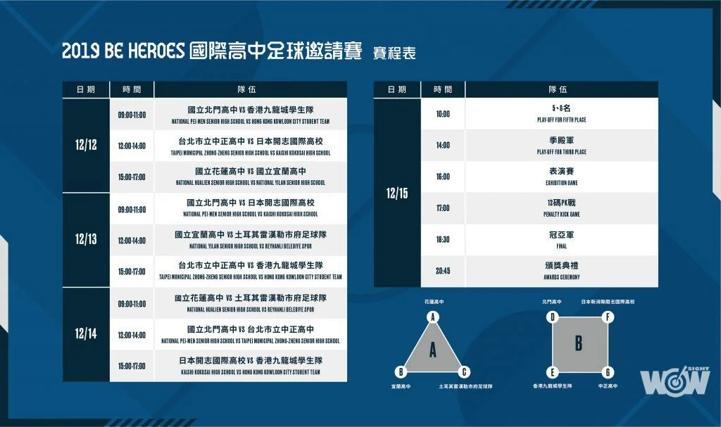 2019 BE HEROES國際高中足球邀請賽將於12月12日至15日在輔大足球場舉行,相較於去年首屆4隊參賽,今年規模更大,包括地主派出花蓮高中、北門高中、宜蘭高中與臺北市立中正高中以外,外隊部分更力邀土耳其、日本與香港參賽,參賽球隊更多,比賽競爭強度更高,對本土高中球員的刺激將更令人期待。