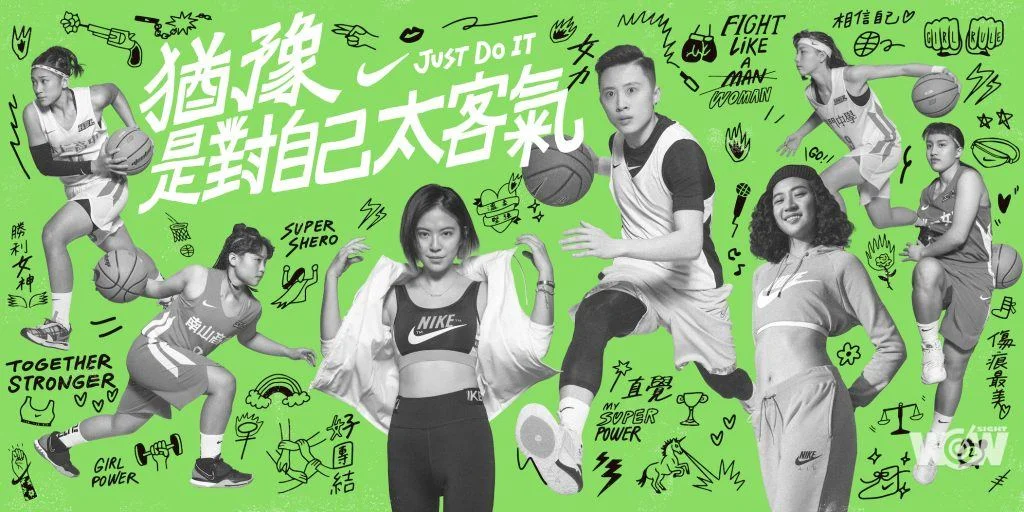 在四強賽前夕,Nike 以一系列「猶豫 是對自己太客氣」主視覺海報, 由籃球運動員彭詩晴、攝影工作者余惟、新生代音樂人 9m88 以及活躍於籃球場上的高中菁英女生球員,共同演繹自信的精神與力量。