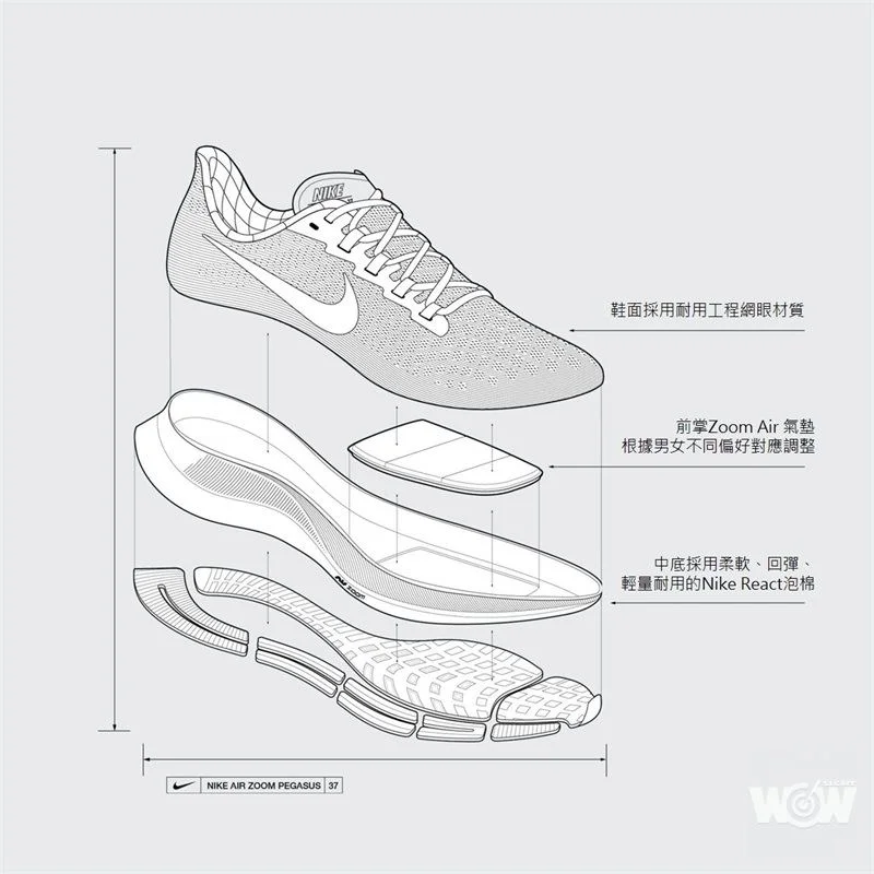 •氣墊設計比Pegasus 36 中的Zoom Air氣墊厚兩倍。