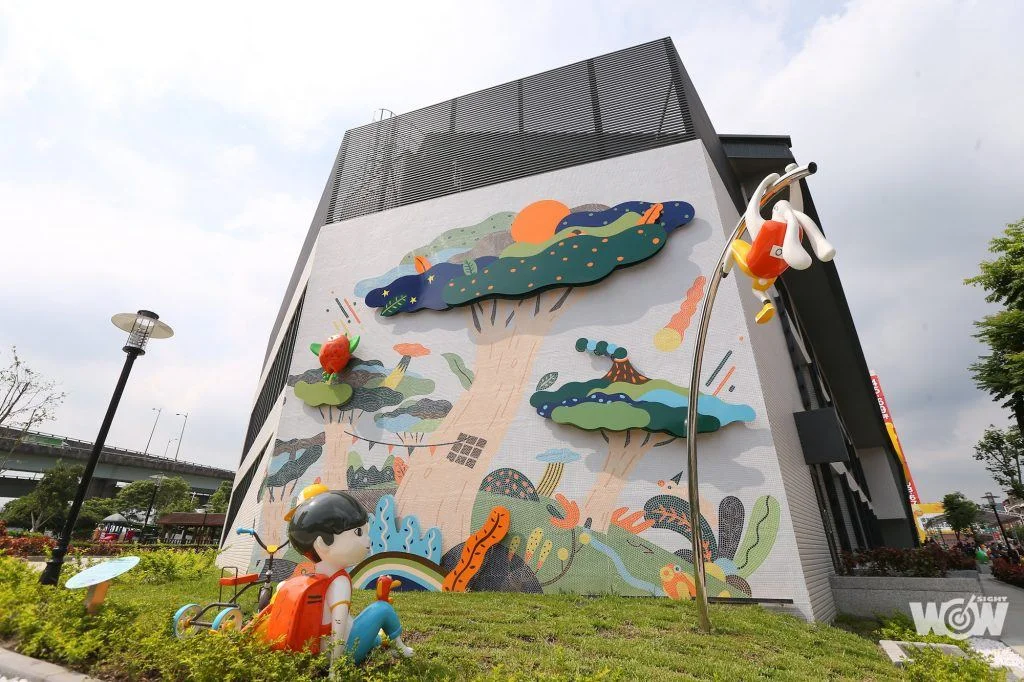 五股國民運動中心特別之處在於與繪本公共藝術團隊、知名插畫家「包大山」及「五七」合作,從場外就可看到一隻隻造型可愛的動物們在做運動,如同帶民眾走入繽紛的動物森林運動會。場館設計以彈塗魚為意象,賦予建築與五股溼地特色相應理念,保留基地內原公園大部分原生樹種及生態水池,將運動場館空間串聯自然與人文,創作出獨一無二的繪本故事。