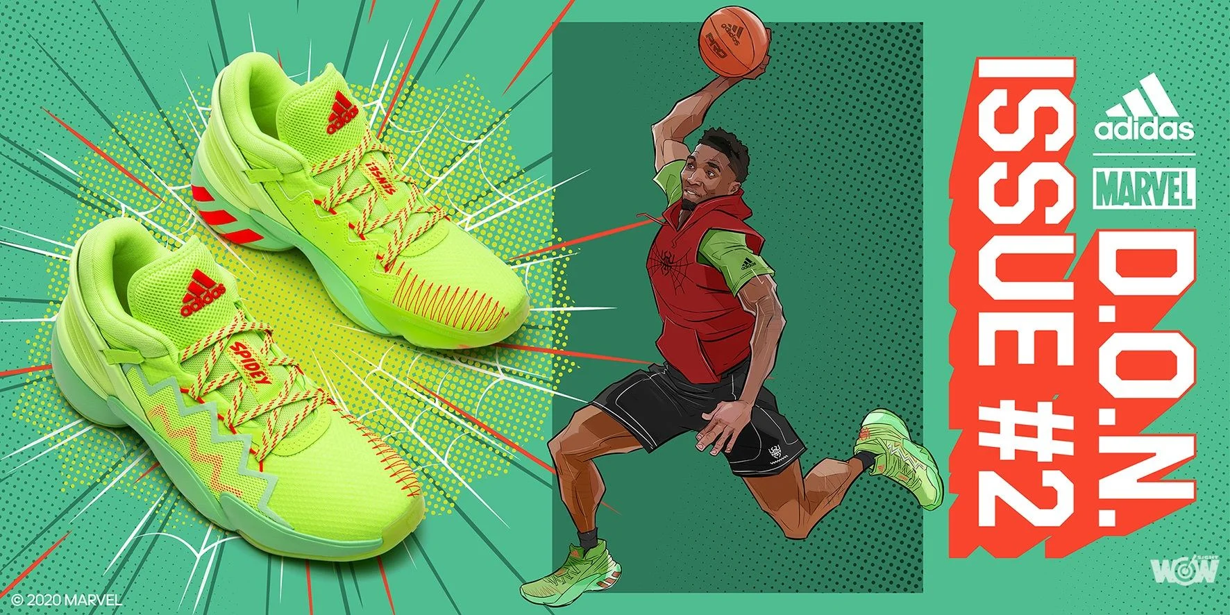 adidas D.O.N. Issue #2 首發配色「Spidey Sense」以螢光綠為主色調,搭配亮眼紅與薄荷綠兩色點綴鞋面;鞋款設計蘊含蜘蛛人元素與美式漫畫風格,鞋舌延伸處繡上”SPIDEY” “SENSE!”字樣,並於內側畫上蜘蛛人塗鴉圖像,猶如承襲蜘蛛人靈敏感官與超強反射能力,更凸顯聯名鞋款的獨一無二。