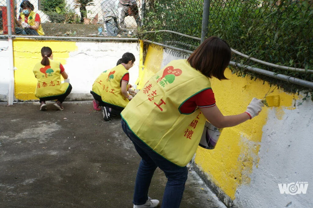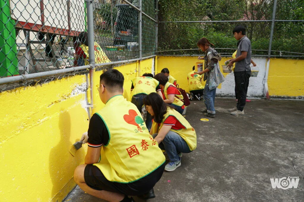「因為從小在這邊長大,阿公阿嬤帶我來這教會,我覺得時間到了就要感恩、要回饋,所以很感謝在國泰幫忙下,讓我能回來贊助回饋這教會。」林子偉拿起畫筆,忍不住笑了出來,「其實彩繪不容易耶,我對美術真的不是很懂,所以寫自己名字有點歪七扭八的。」