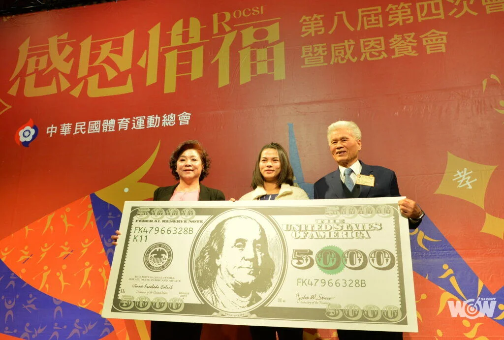 會長張朝國已發給許淑淨在敦奧獲得銀牌的五千美元獎金,如今遞補金牌,獎金是一萬美元,今天她到場補領金五千美元獎金。