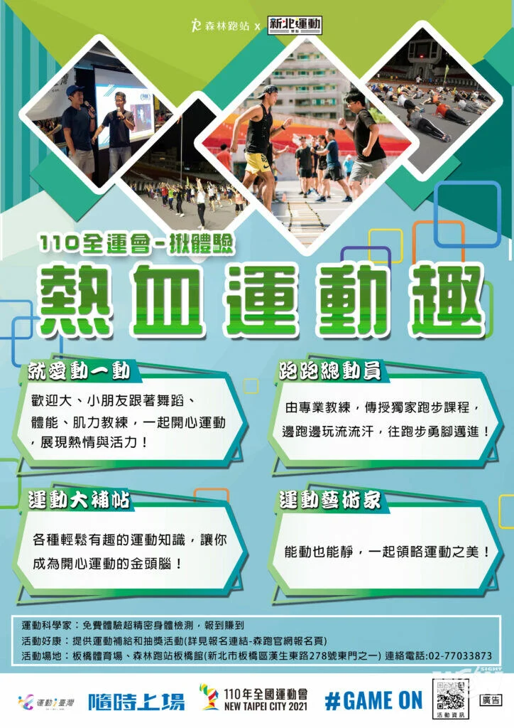 體育處補充說明,板橋第一運動場的免費課程,以主題系列課程方式,固定時間、定點培養民眾運動習慣,自3月17日開始有跑步訓練課,週三、週四晚間為初階課程,週六則是進階課程,鼓勵提早線上登記報名,由專業教練帶領大家正確跑步、開心跑步,詳見森林跑站報名網頁;還有每週三常態性的有氧舞蹈課程、肌力課等,不需要事先報名可隨時加入參加,現場還提供量補給品,超有趣的主題課程將持續到10月份,詳細動資訊請持續追蹤臉書粉專【新北運動聚點】。