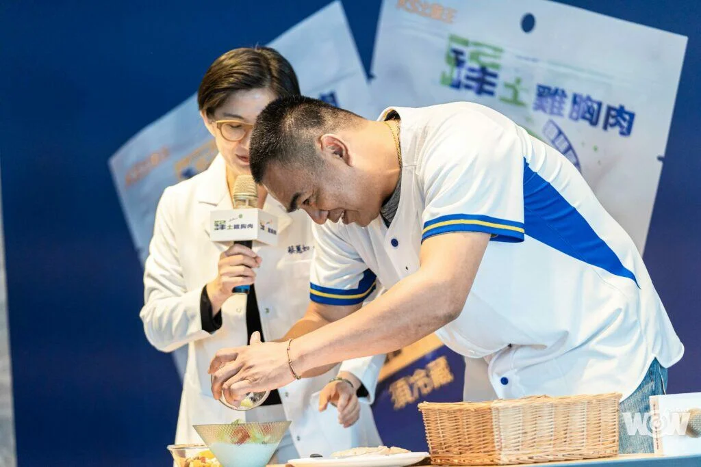 就像鋒哥在品牌影片強調的產品特色,「Q彈、多汁、高優質蛋白」,他也在現場介紹土雞胸肉的創意吃法,希望把這項健康的產品推廣給更多人,鋒哥親自擺盤,秀出產品料理多樣性,率性的鋒哥下廚時,流露出不同於場上的柔情。