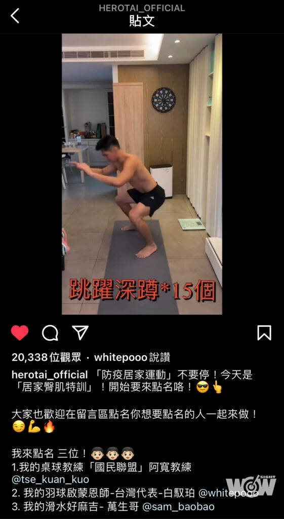 健身藝人祖雄先前曾向白馭珀學習過羽球,也因此相識成為好友,這波疫情期間,祖雄也很有默契地在社群上發起居家防疫運動,分享自己的健身動作,並且與白馭珀相互點名,一起為防疫努力。