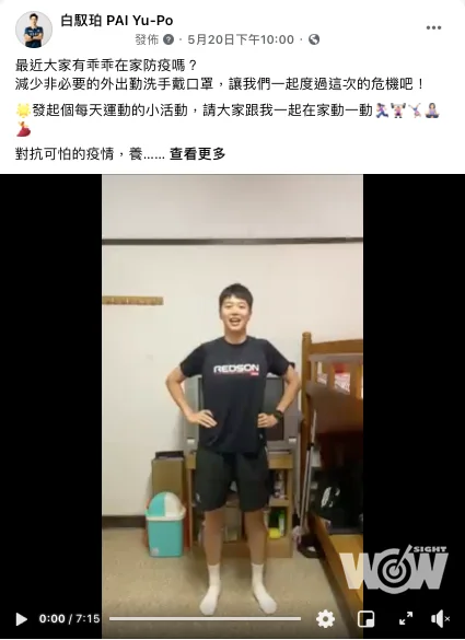 白馭珀覺得身為運動員,即使居家防疫,生活也不能太過放縱,要維持基本體能和訓練,等到全球賽事恢復後,才能以最佳狀態應戰,「防疫期間待在家這麼久難免會覺得悶,但大家可以跟著我每天規律 做運動,這樣就有相互陪伴的感覺了,一起羽珀同行 Play with PO!」