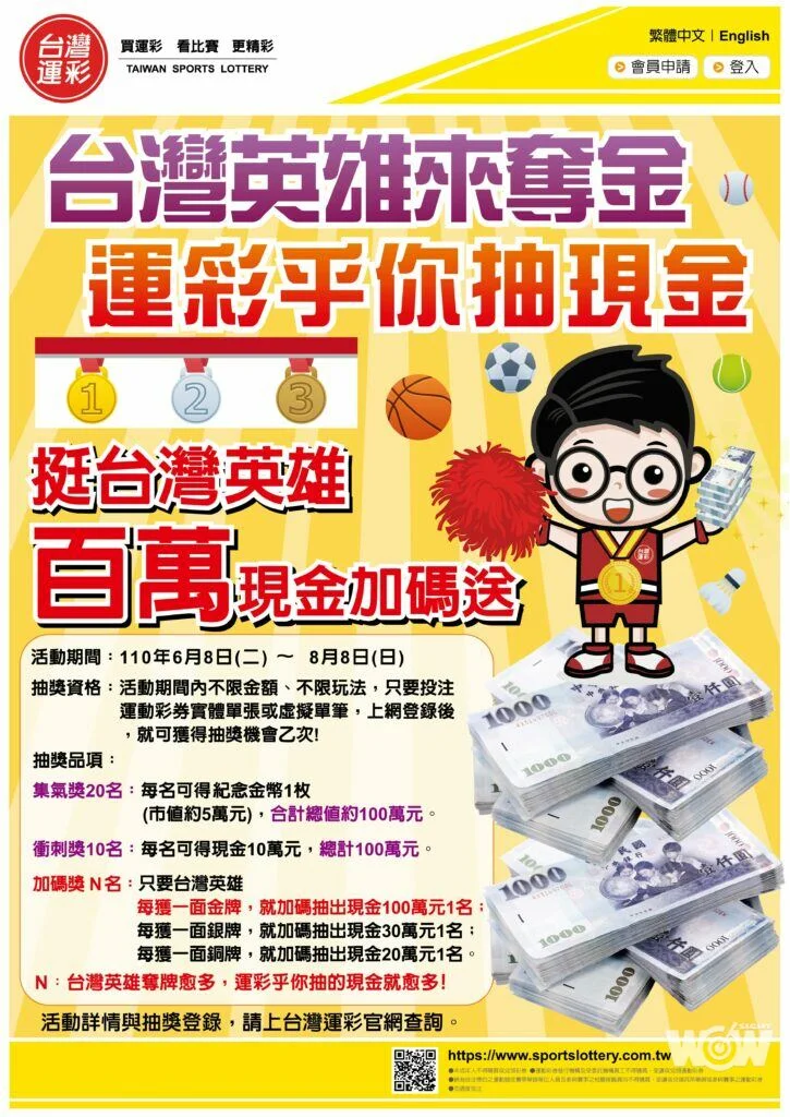 為回饋給用投注挺體育的消費者及號召大家一起為中華代表隊加油,台灣運彩即日起到8月8日辦理「台灣英雄來奪金 運彩乎你抽現金」活動,獎項包括價值約5萬元的限量版紀念金幣20枚以及10萬元現金10份,另外還加碼「奧運奪牌獎」,臺灣英雄每奪一面金、銀、銅牌,就加碼抽出100萬元、30萬元、20萬元現金,臺灣英雄奪牌數愈多,加碼抽出的現金就愈多,獎金無上限。