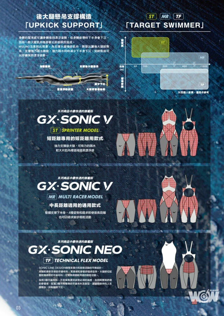 「GX SONIC」系列泳褲目前已進化到第五代,後大腿支撐構造「Upkick Support」能懸吊後大腿,支撐強大踢水機能,並減少下半身下沉,可以減低選手疲憊,一路到終點都能維持漂浮姿勢。