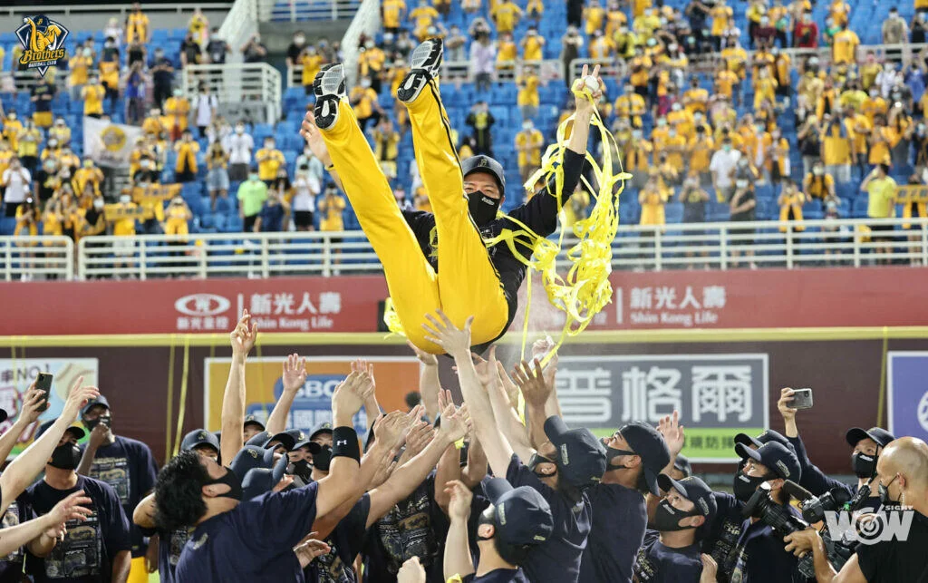 黃澄澄彩帶拋入場內,中信兄弟昨晚在拋彩帶「禁地」桃園球場奪勝,如願擊敗樂天桃猿讓魔術數字歸零,成功在上半季封王,也拿下隊史第17次季冠軍。