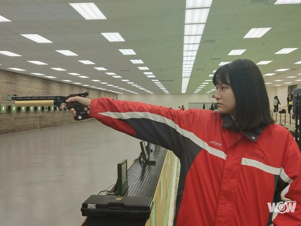 她原本最早升上高一時,被教練詢問要不要兼著練習運動手槍,但那時沒想太多,只覺得練一項就好,無法分心顧及運動手槍。直到看見隊友練習,感覺很特別,才於今年暑假、八月底初次扣下運動手槍扳機,感受那股衝擊。