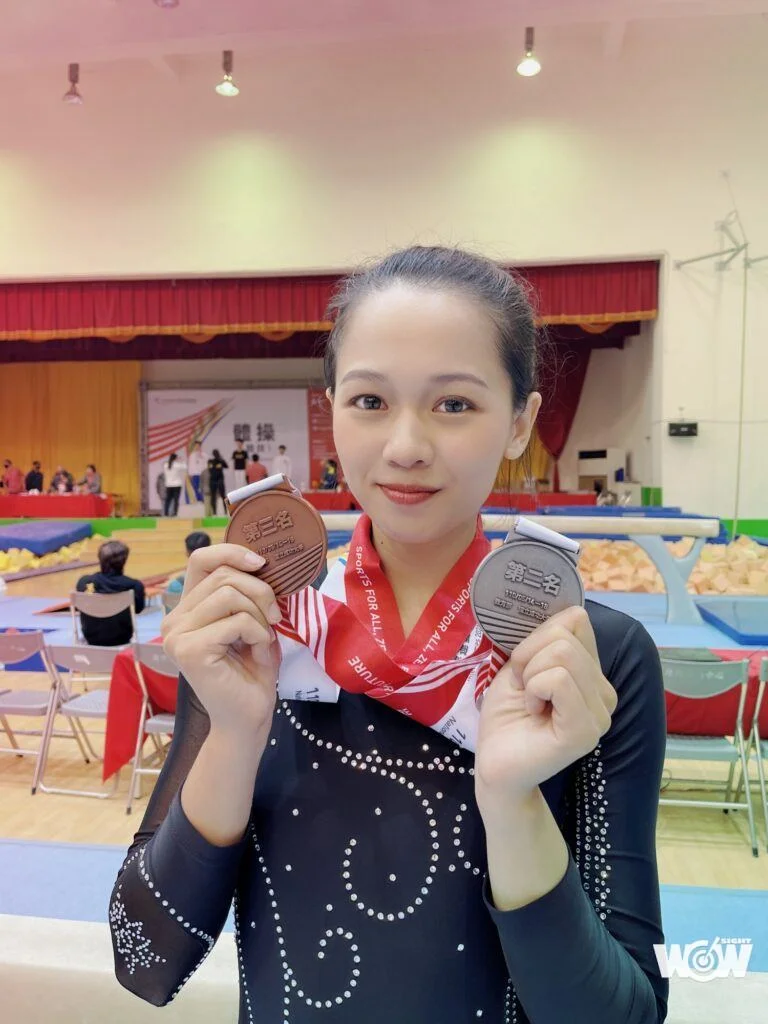 黃郁珊上場時,非常投入其中,享受沉浸在比賽氛圍裡,她覺得身為表演者,就是把這當作一場演出,賽後她握著兩面獎牌苦笑,「經過疫情,一開始我也有一點猶豫,因為我已經畢業了,來參加這個比賽(成功全大運競技體操從5月延辦到12月),推掉一個公演,也滿對不起劇團的大家,但就是很開心我有得獎,我的假沒有白請,給自己跟教練一個交代。」