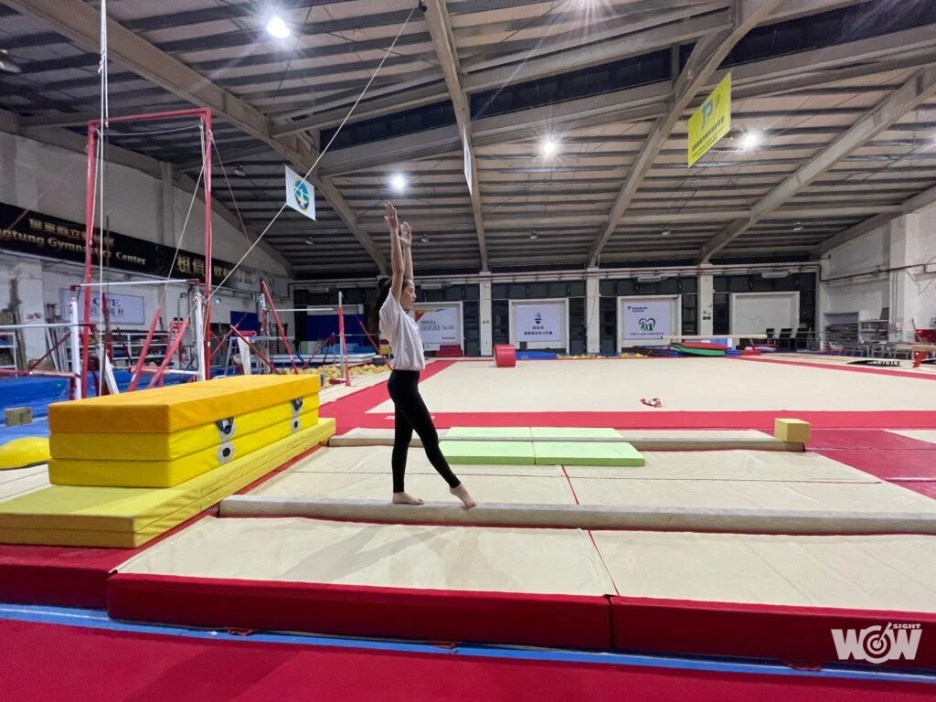 身形修長的黃郁珊從小學跳舞,累積一定基本功,她覺得舞蹈裡頭有側翻、前軟翻、後軟翻,其實類似競技體操裡面的動作技巧。她大學時剛好造訪屏東體操館,一開始只是玩耍練空翻,但在教練劉安鈞推坑下,意外報名參加成功全大運競技體操一般組。
