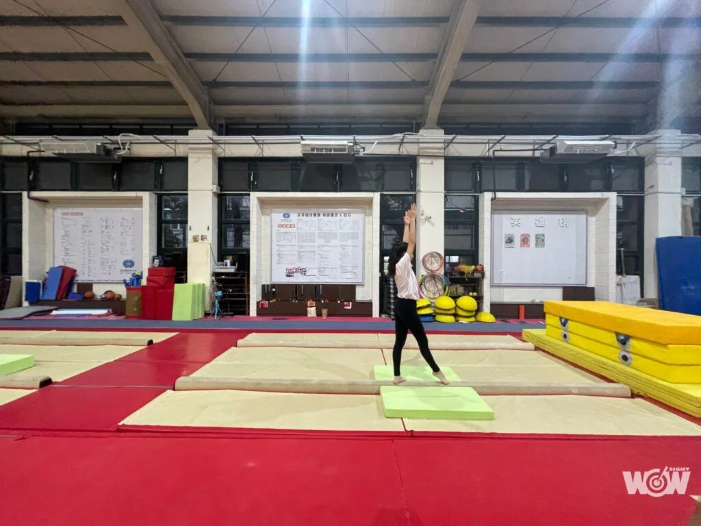 身形修長的黃郁珊從小學跳舞,累積一定基本功,她覺得舞蹈裡頭有側翻、前軟翻、後軟翻,其實類似競技體操裡面的動作技巧。她大學時剛好造訪屏東體操館,一開始只是玩耍練空翻,但在教練劉安鈞推坑下,意外報名參加成功全大運競技體操一般組。