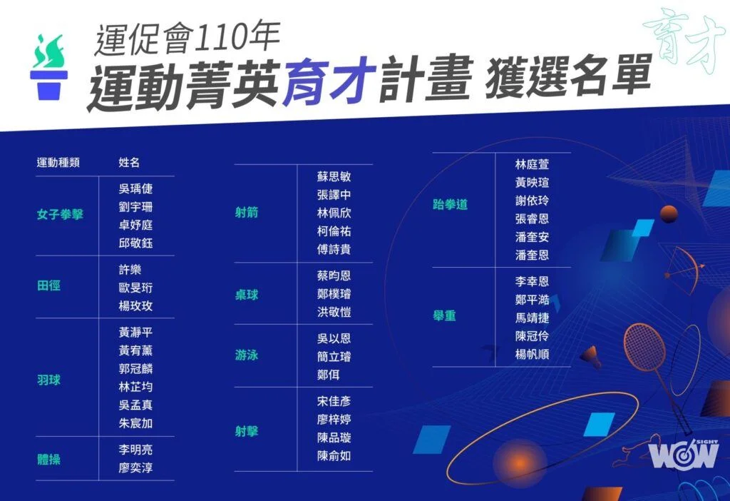 今年度110學年度「運動菁英育才計畫入選名單」,共選取菁英計畫選手40名,育才計畫選手41名。針對過去在國際競技場上較具奪牌競爭力之運動種類,選定田徑、羽球、體操、射箭、射擊、桌球、游泳、舉重、女子拳擊、跆拳道等,目標鎖定於2028與2032奧運具奪牌潛力之選手提供贊助。今年有多達近500位選手報名,主要參考選手參加各項國內外運動賽事成績及個人基本條件等競技潛力要素,歷經運動種類小組會議、技戰術委員會議與董事長會議,多次專家會議激烈討論後決定出人選。