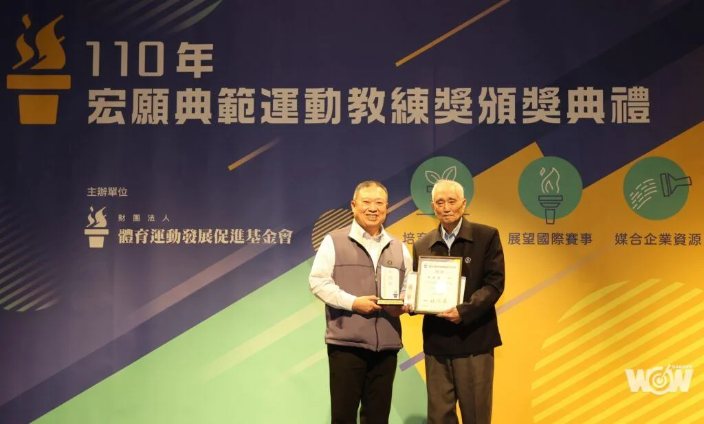 體育運動發展促進基金會舉辦「110年宏願典範運動教練獎」,這獎項邁入第四年,頭一回頒發個人獎項,除績優訓練外,另設置全人培育、偏鄉服務、團隊經營、特殊奉獻與宏願獎等6個獎項,表彰長期貢獻體育運動的教練。
