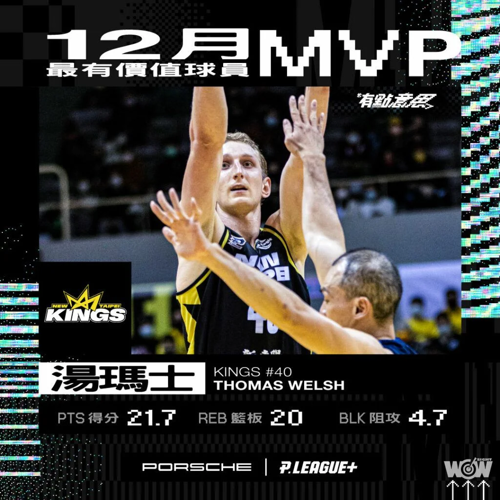 P.LEAGUE+ 公佈2021-22賽季Porsche 12月最有價值球員,新北國王的湯瑪士(Thomas Welsh)本月繳出平均21.7分20籃板的「雙20」成績,外加聯盟12月單月最高的4.7阻攻,帶領剛加盟PLG的新北國王在開季拉出3連勝佳績,優異的表現也讓湯瑪士獲選12月最有價值球員。