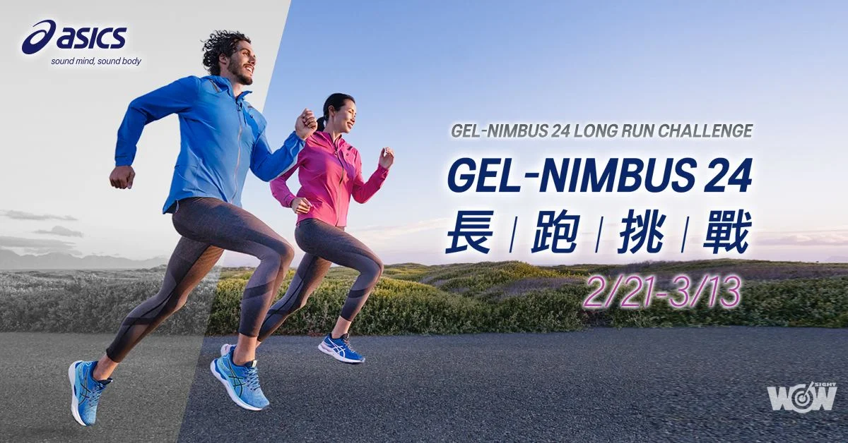 嶄新一年ASICS推出ASICS GEL-NIMBUS 24長跑挑戰賽,即日起至2月20日至馬拉松世界報名,即可於2月21日至3月13日累積跑步里程數,凡完成24km跑者,可獲得ASICS官網GEL-NIMBUS 24專屬200元商品折扣,以及ASICS跑步背包10L抽獎資格;跑步里程累積至124km者,則有機會抽中ASICS平織防撥水外套及全新一代GEL-NIMBUS 24跑鞋。ASICS邀請跑者挑戰自我,並迎接GEL-NIMBUS 24時代來臨!