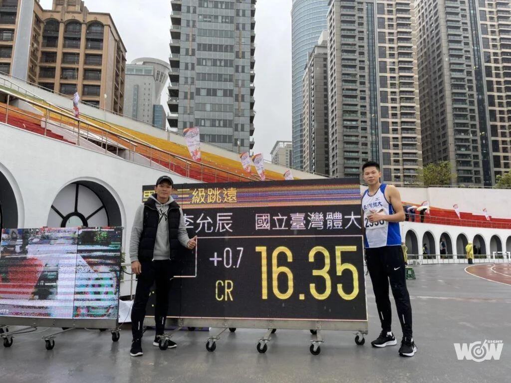 「一開始不知道成績多少,但我知道有達標,直到裁判老師他們拉皮尺出來,才知道成績比我想像還驚人。」李允辰過去個人最佳為16公尺22,排歷年第四位,這天跳出16公尺35,超越第三位的好手李奎龍,與前輩陳明智並列國內男子三級跳遠第二傑,距離乃慧芳的16公尺65、高懸33年的障礙,不遠了。