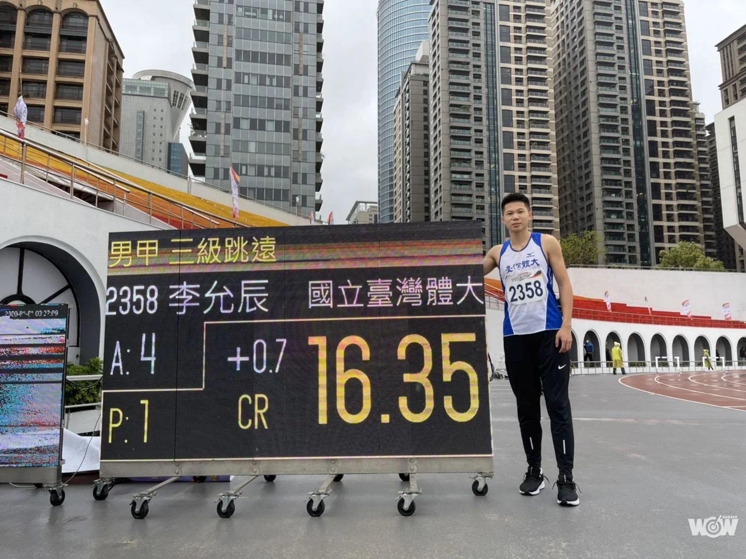 「當下看到成績,原本很想大叫,就是,終於突破自己,但最後只有留在心裡吶喊。」台灣體大李允辰在111年全國大專院校田徑公開賽三級跳遠決賽,驟雨中跳出16公尺35,突破個人保持的大會紀錄,也躍上台灣第二傑,僅次乃慧芳的全國紀錄,並順勢取得杭州亞運門票。