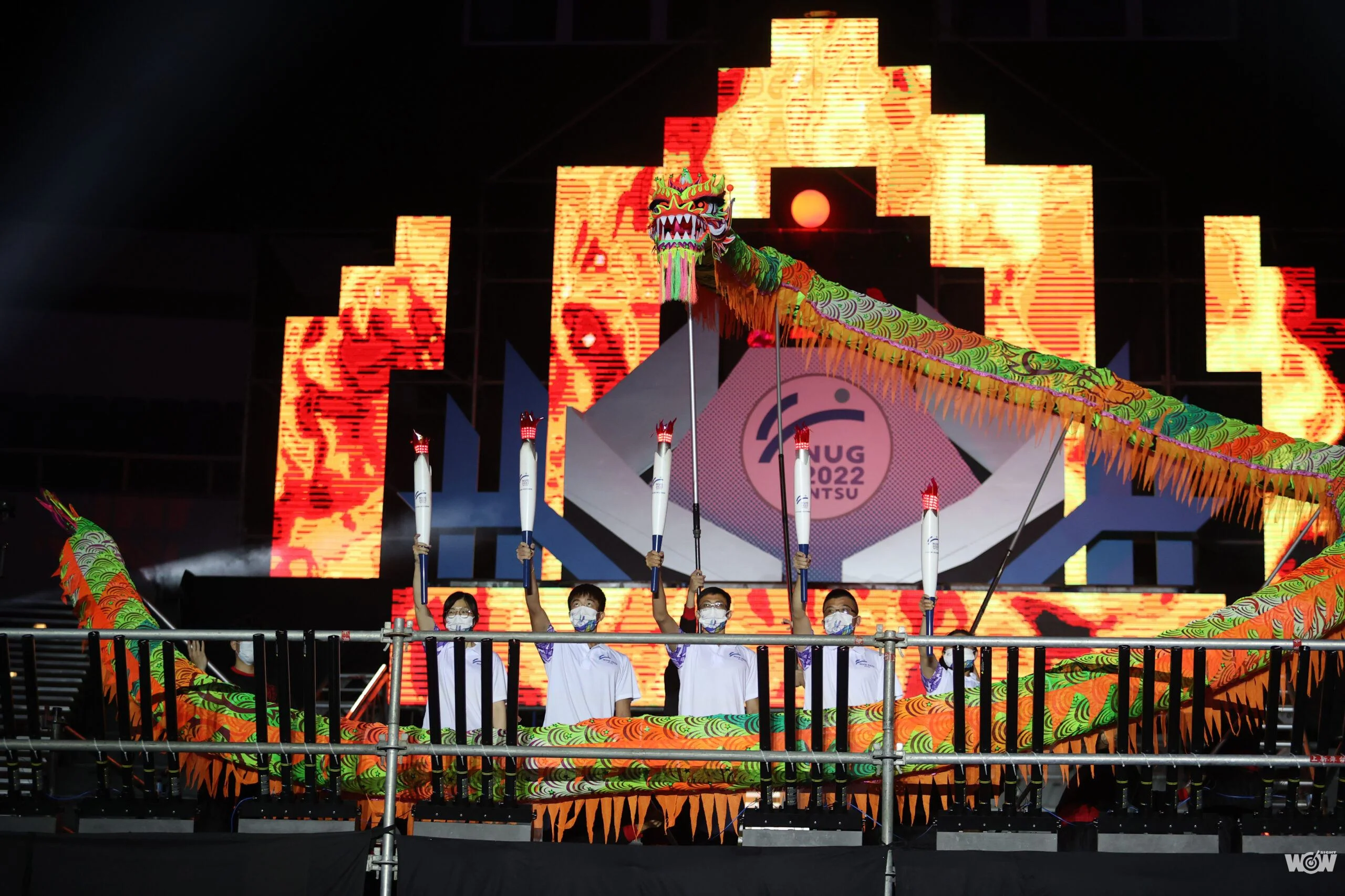 而壓軸的聖火引燃儀式集結五位由國體大栽培出的奧運國手,朱木炎、陳葦綾、陳詩園、吳蕙如、鄧宇成擔任火炬手,結合國體大舞龍隊的「龍神」,以雷射方式點燃龍珠,象徵取得母火,作為聖火之源,祈求並祝福運動員的傳承與新生!