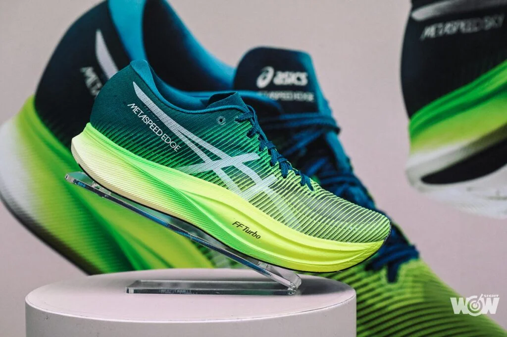 針對步頻型跑者設計的METASPEED EDGE+則增加16% FF BLAST TURBO含量,鞋款厚度明顯增加,不同的是碳纖維板設置較低,且彎曲度較高,為了幫助滾動推進轉換而設計,讓跑者維持跑步節奏同時促進加速效果。