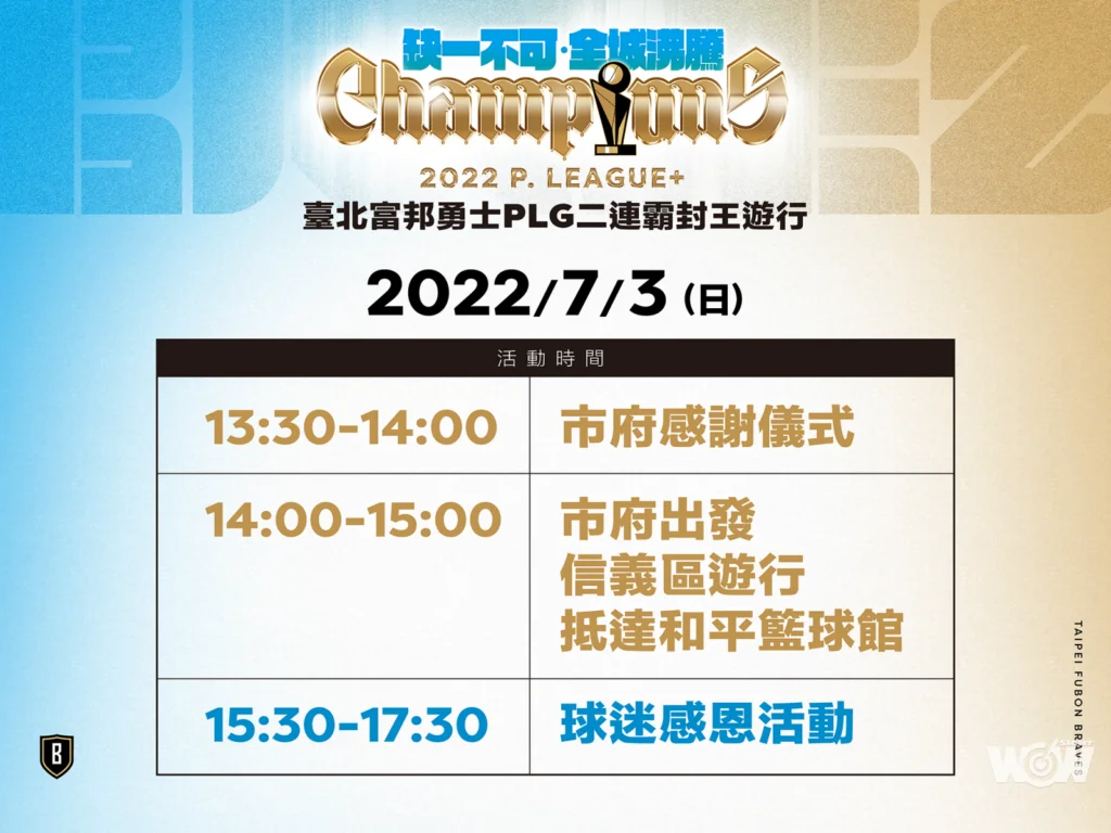 臺北富邦勇士勇奪2021-2022 P. LEAGUE+總冠軍,連續兩年拿下總冠軍稱霸籃壇。這份榮耀與喜悅將正式在本周末與整座臺北市和所有球迷分享,臺北富邦勇士於7月3日周日下午舉行二連霸封王遊行!勇士從臺北市政府出發至主場和平籃球館,這將會是台灣職籃首次的冠軍遊行活動。榮耀時刻,缺一不可!