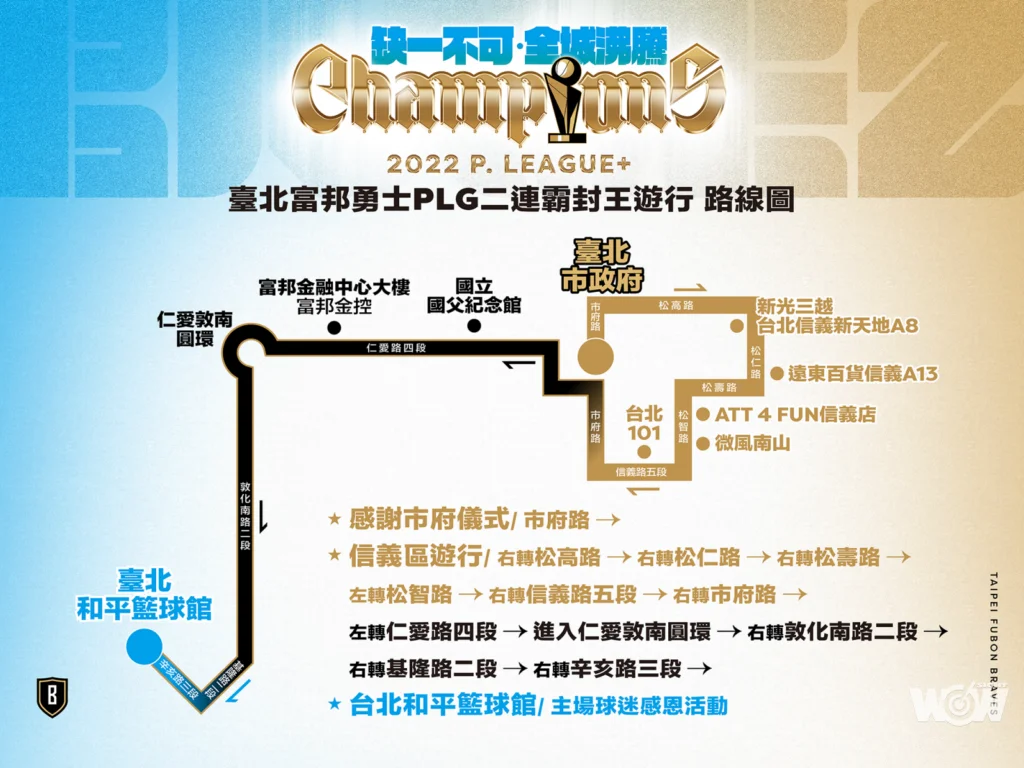 富邦勇士代表臺北市出戰已滿三個賽季,這座城市給予勇士無限的支持力量,勇士憑藉著這份力量完成冠軍任務將榮耀回歸給臺北市,7月3日下午1點舉行臺北市政府感謝儀式,為整個冠軍遊行揭開序幕。 臺北富邦勇士帶著冠軍金盃和冠軍紀念商品致贈臺北市政府,並與臺北市政府蔡炳坤副市長、臺北市政府體育局李再立局長及市府長官見面分享。結束北市府感謝儀式,勇士們與應援雙帥Travis和比爾以及Fubon Angels將搭乘勇士冠軍雙層巴士出發,跟隨P. LEAGUE+的MVP冠名贊助合作夥伴Porsche台北保時捷中心所提供的前導車Porsche Taycan,從市府路出發造訪整個信義商圈和台北101,隨後在仁愛路四段上經過國父紀念館以及富邦金融中心大樓,最後一路往南至勇士的主場和平籃球館,全長約6.3公里。