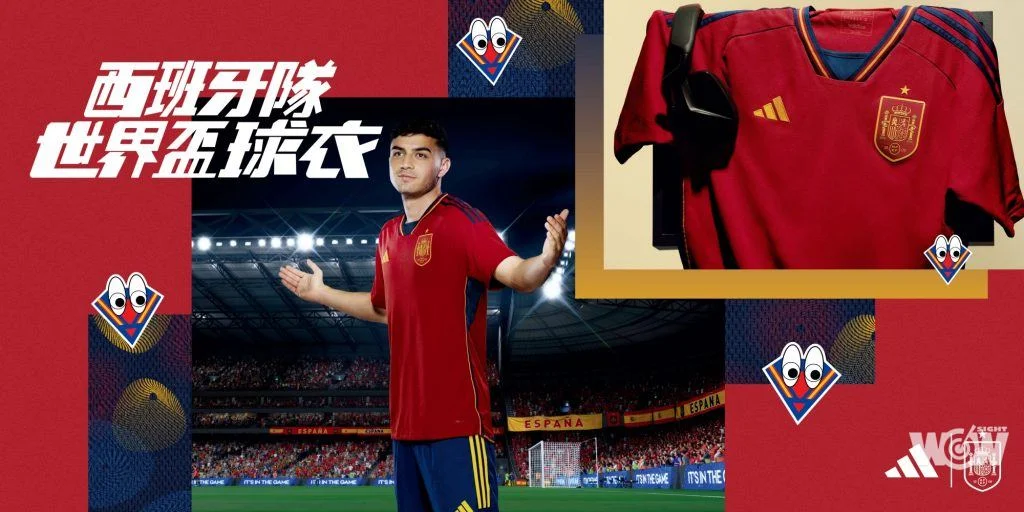 西班牙隊以充滿力量的鮮豔紅色為主調,並以國旗上的黃色點綴,肩上的品牌三條紋則以海軍藍呈現,三個主色同樣以三線環繞領口處,細節充滿設計感。整體靈感來自於西班牙舉國上下的團結一致,球員化身紅衣戰士,齊心揮汗爭取榮耀。