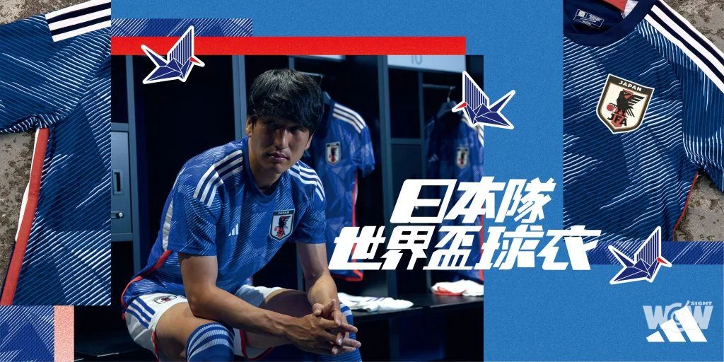 「千紙鶴」在日本象徵和平之意,人們會摺上千隻紙鶴來表達祝願心意。本屆日本隊主場球衣的正面和袖口以形似千紙鶴的幾何圖案為底,深藍色系輔以紅色線條點綴呈現日本「晴朗無雲」的在地印象。胸口隊徽「八咫烏」取自日本神話中的太陽神化身,後頸處則繡上日本國旗,承載著全國球迷的愛與祝福。